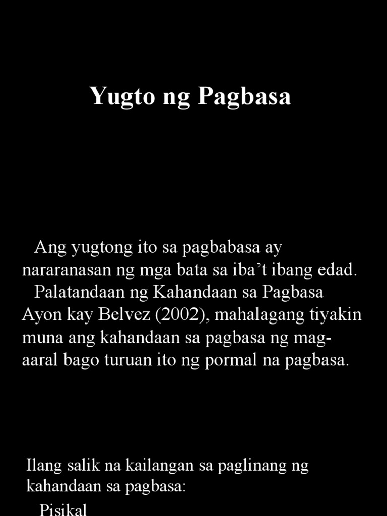 Mga yugto ng pagbasa ayon kay Julio Alvarado Pagkilala. Ayon kay Toze ang pagbasa ay nagbibigay ng impormasyon na nagiging daan sa kabatiran at krunungan. Ang isang estudyanteng palabasa ay mas may malaking posibilidad na maipasa niya ang mga pagsusulit na ibibigay ng guro kumpara sa.