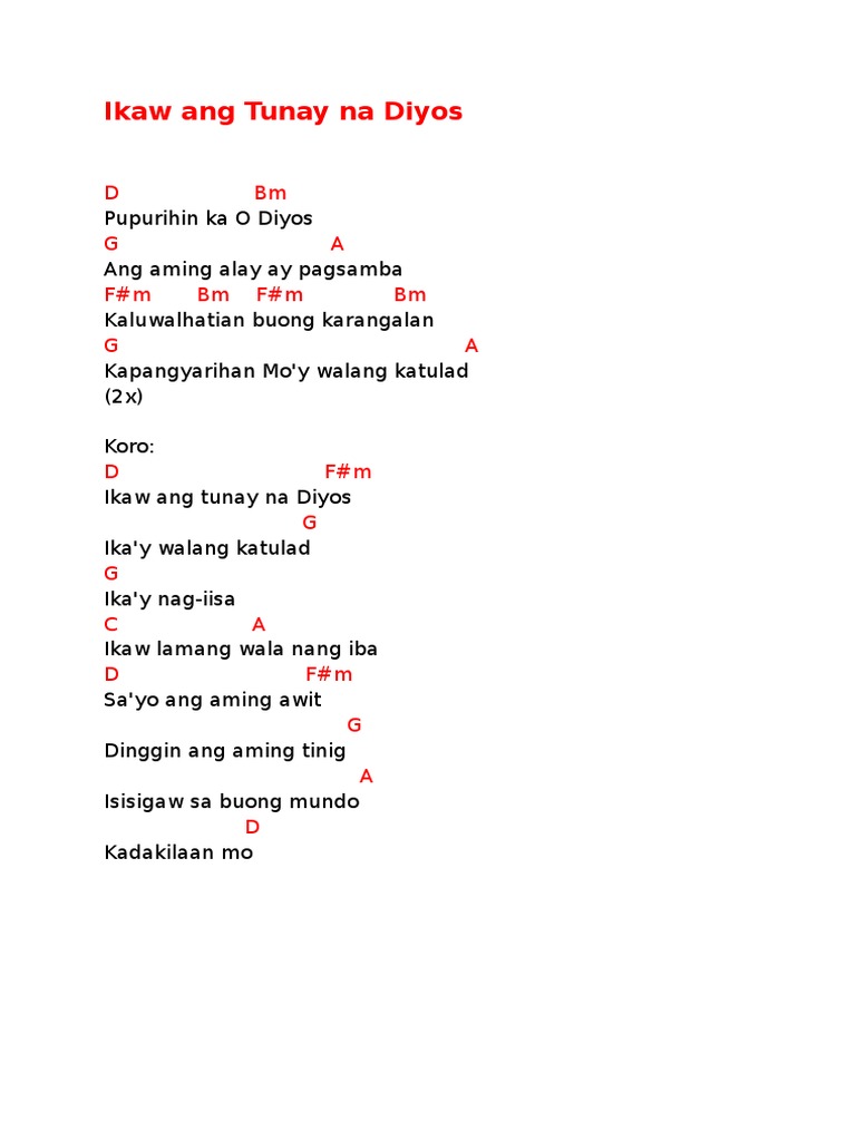 O Diyos Ikaw ang tunay na Dakila sa mundo Ikaw ang Haring nagmahal ng tulad ko Sundin ang loob Mo Iparinig ang nais Mo Chorus II. Ikaw ang tunay na Diyos Ika y walang katulad. Posted-on January 6 2014 July 3 2021 By line Byline jhu.